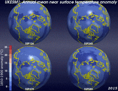 Figure 3. Dynamic visualization of near-surface temperature, as determined by UKESM1, for the four CMIP6 future projections; land areas are represented by yellow coastlines.