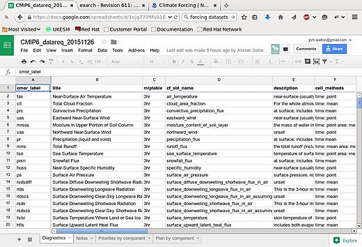 The document has been made available as an export from a central Subversion version control repository, which facilitates the tracking and undoing of changes to the list. Part of the request (reformatted as a spreadsheet in Google Docs) is shown in Figure 1. Each row corresponds to a variable (the full request comprises about three thousand of these), and each column corresponds to a variable attribute – for example, its name, dimensions, type and frequency of temporal output, and the experiment for which it is required. Currently, each variable has twenty-two attributes.