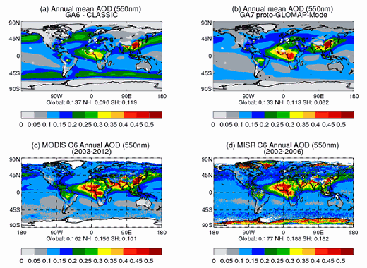 Figure 2. Annual mean AOD at 550nm in (a) GA6 CLASSIC simulation, (b) GA7 prototype simulation with GLOMAP-Mode, (c) MODIS and (d) MISR observations. Model simulations are taken from years 2002-2008 of a 20 year free-running AMIP simulation. Observations cover the period 2003-2012 for MODIS and 2002-2006 for MISR.